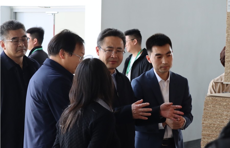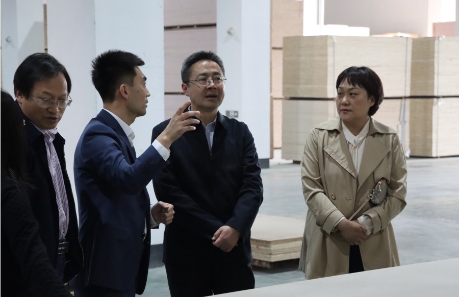 領導一行先后參觀了千山新建自動化生態板生產車間、高標準成品庫、國內先進的浸漬膠膜紙飾面人造板自動化壓貼生產線,對工廠先進化、設備智能化、板材無醛化,給予了充分肯定。