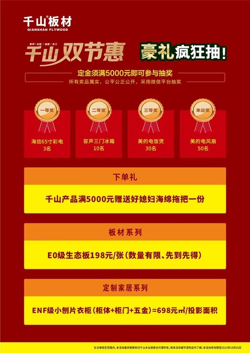 2023年9月26日,千山板材第五屆雙節惠暨千山板材新品發布會在江西省贛州市火爆開啟!活動時間長達一個月,工廠直供,產品質量優異,價格實打實優惠!本次活動不僅為消費者提供了勁爆的優惠政策,更是奉上了一系列驚喜豪禮與真摯服務。