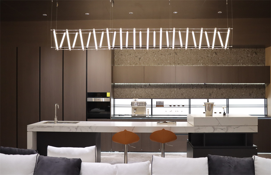 跟隨展廳動線,來到了現代風格的開放餐廚展區。護墻板主體顏色為侘寂風×朝陽橙,采用18厘ENF級刨片板,展示柜采用意大利石紋×芬蘭玉石,營造現代富有格調的空間氛圍。