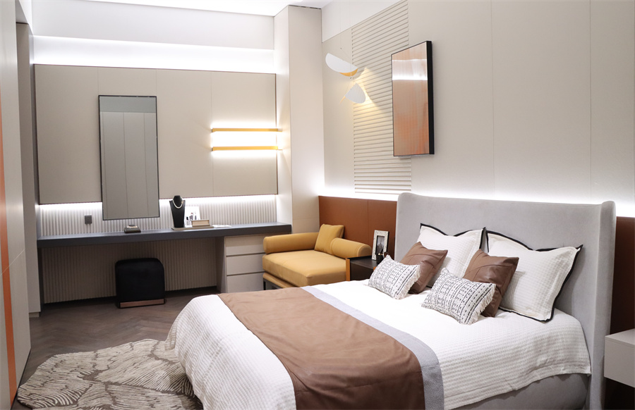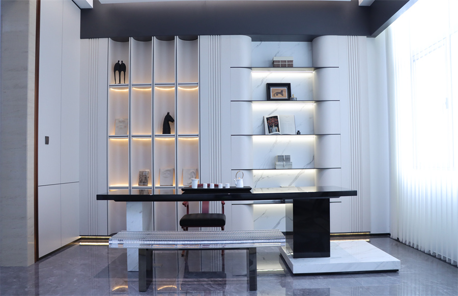 展廳五大空間呈現現代極簡、現代輕奢、新中式三大主流家裝風格,采用千山板材四大品類,糅合六大系列花色:木紋系列、純色系列、石紋系列、同步系列、數碼系列、PET系列,演繹多元化生活場景。