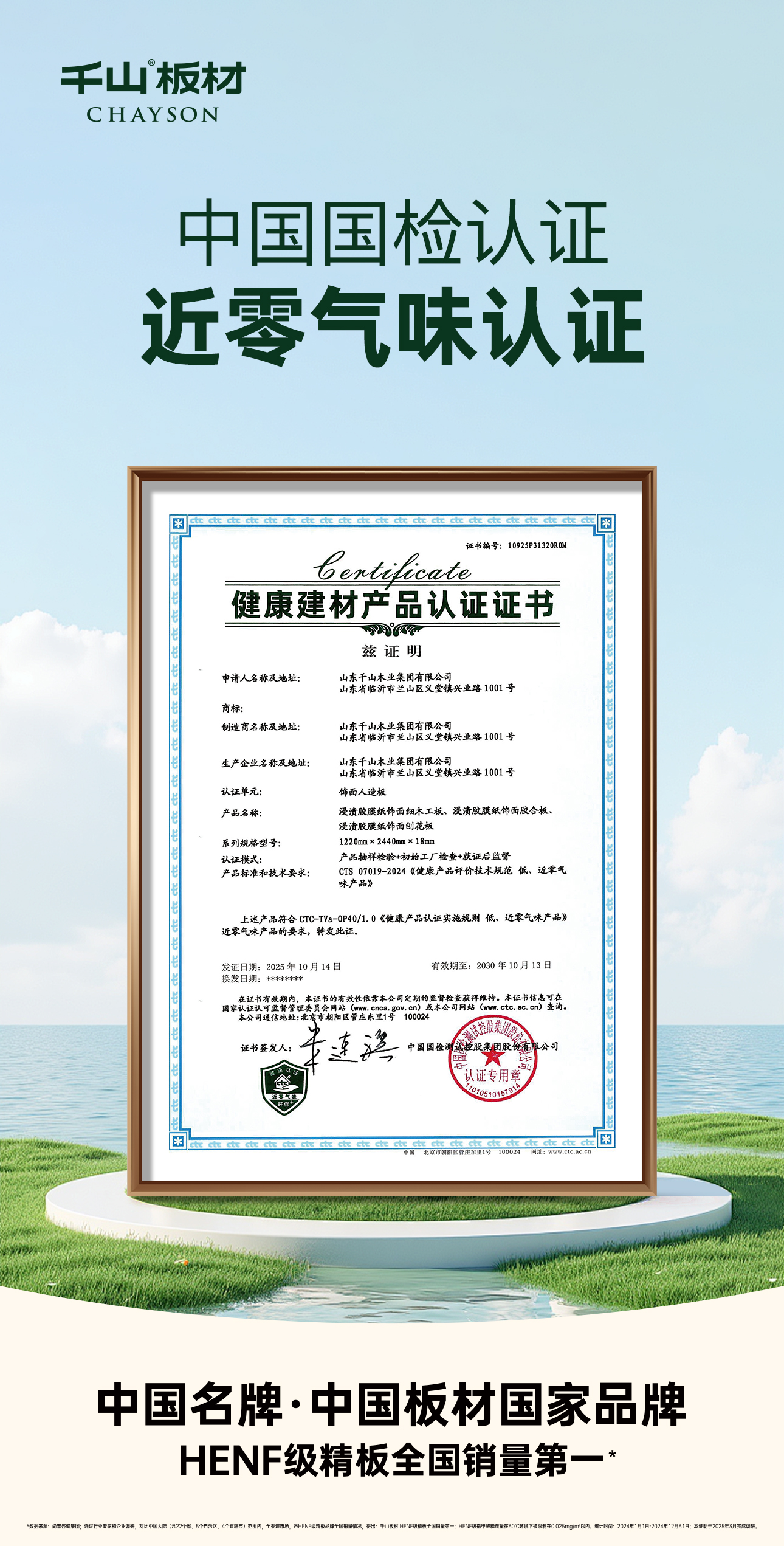 與此同時,千山板材核心產品憑借出色的環(huán)保性能與近乎零氣味的表現,成功榮獲由中國國檢集團頒發(fā)的近零氣味健康建材產品認證證書。這一認證充分彰顯了千山板材在降低 TVOC 等污染物、攻克室內異味難題方面的深厚技術實力。