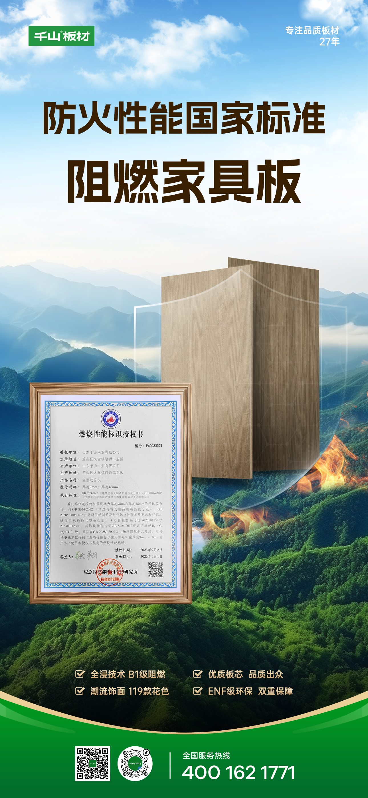 從“符合標(biāo)準(zhǔn)”到“主動防護(hù)”,板材安全性能成為大家極為關(guān)注的重要指標(biāo),特別是在家庭環(huán)境中,健康和安全是首要考慮因素。千山阻燃家具板,將科技飾面與安全阻燃技術(shù)相融合,為家居空間“抵抗力”加分。千山阻燃家具板,具有專業(yè)防火阻燃性能,能夠抵御火災(zāi)威脅,為我們的家居空間筑起一道安全防護(hù)墻。 #1 全