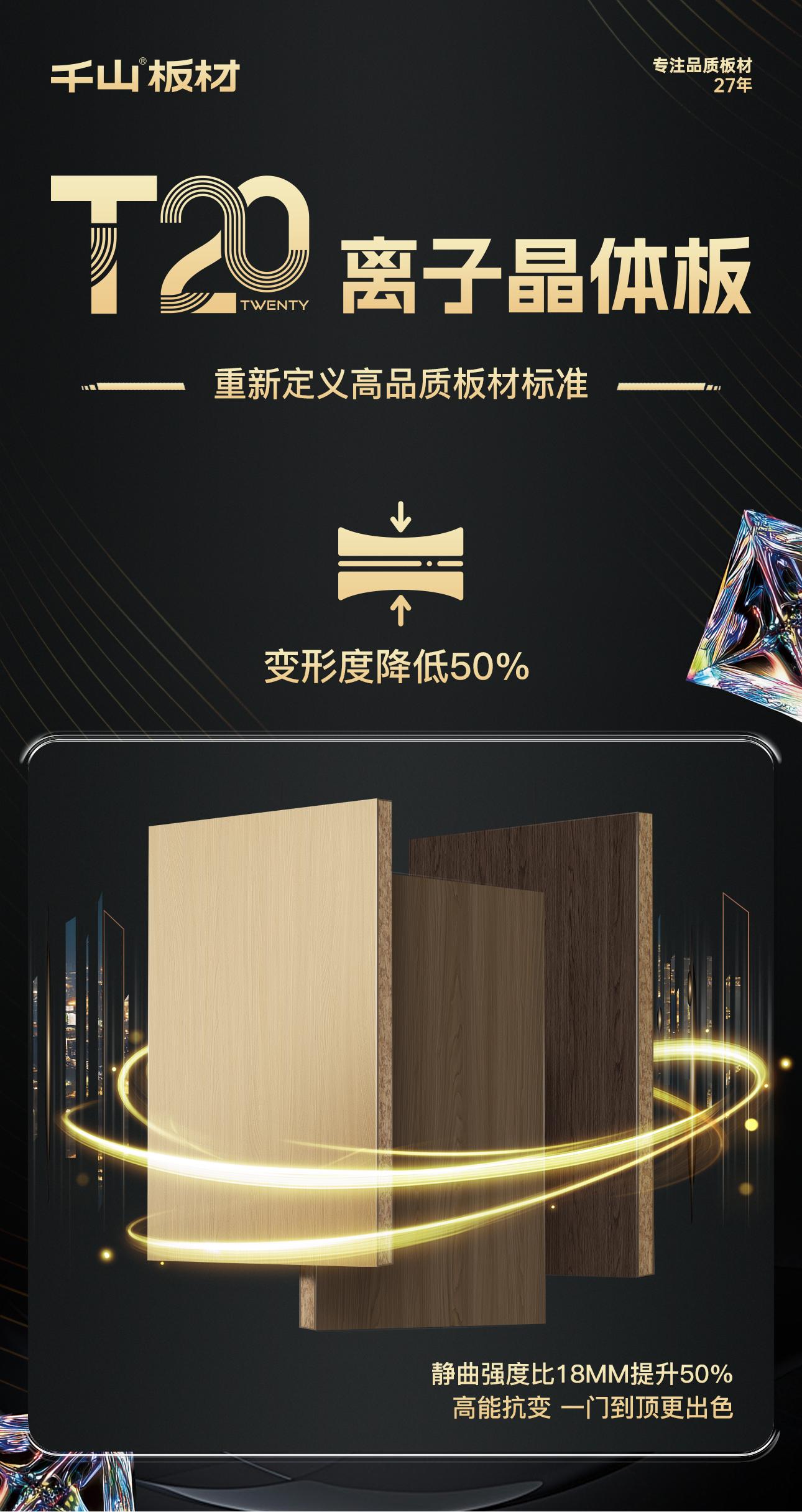 隨著當(dāng)代消費(fèi)者對空間美學(xué)與功能品質(zhì)的升級需求,通頂柜體設(shè)計與超規(guī)格門板已成為高端家裝與商業(yè)空間的主流選擇。然而,普通板材在承載通高設(shè)計時,面臨形變、龜裂甚至扭曲風(fēng)險。想要“一門到頂”更長久耐用,就對板材性能提出了極高的要求。 千山板材重磅推出T20離子晶體板,以20mm厚度、高強(qiáng)承重、高能抗變形、超強(qiáng)