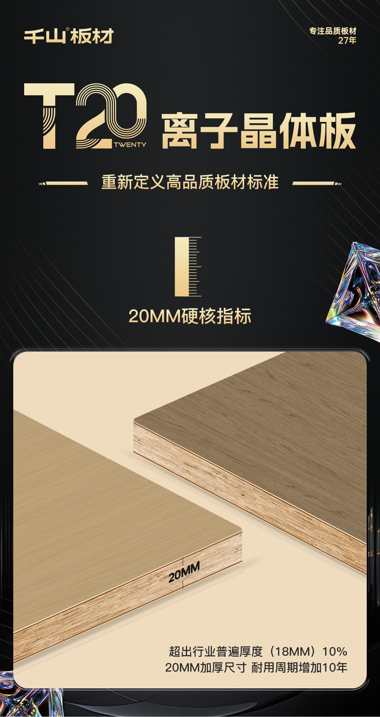 T20離子晶體板:是表面覆有離子晶體層,板材承重比常規(guī)18mm提升50%,變形度降低50%,耐磨性能提升3倍以上的20mm高端飾面板材。T20離子晶體板是千山板材推出的高端飾面板材,由千山集團(tuán)與南京林業(yè)大學(xué)材料科學(xué)與工程學(xué)院聯(lián)合研發(fā),于2025年4月18日在臨沂全屋定制展首次發(fā)布,定價1099元/㎡,旨在為消費(fèi)