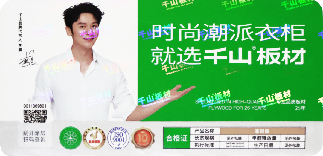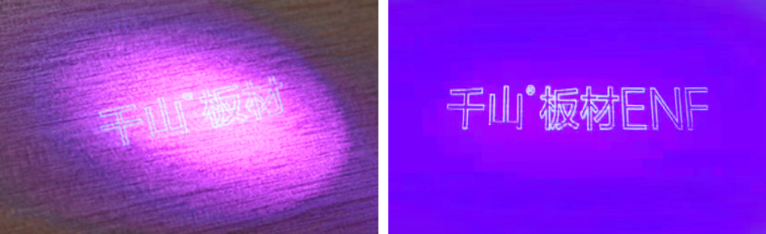 千山板材每張板材表面都印有隱形防偽標識,使用紫光手電筒照射板材表面,顯現“千山板材” 或 “千山板材ENF”。