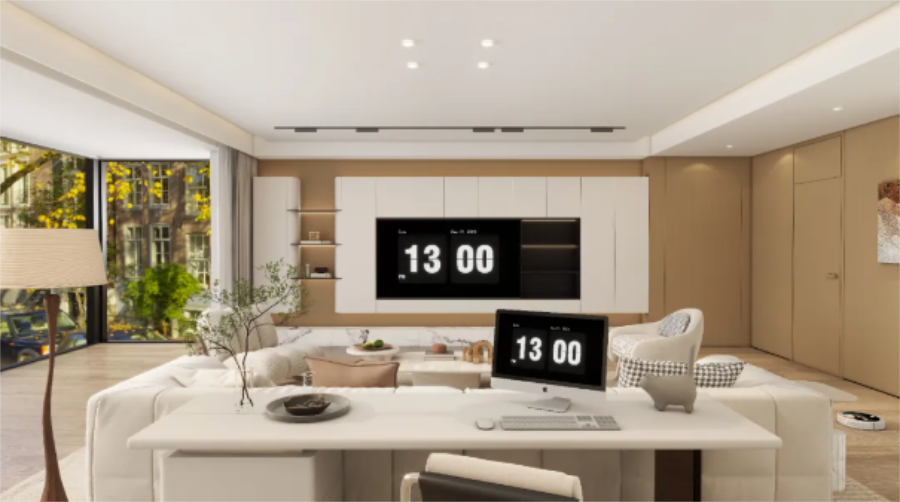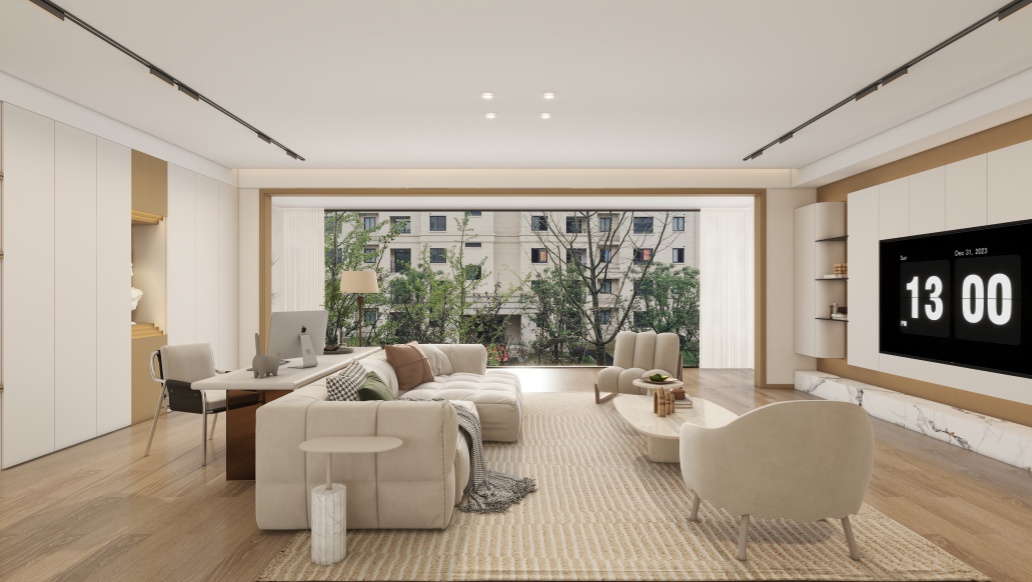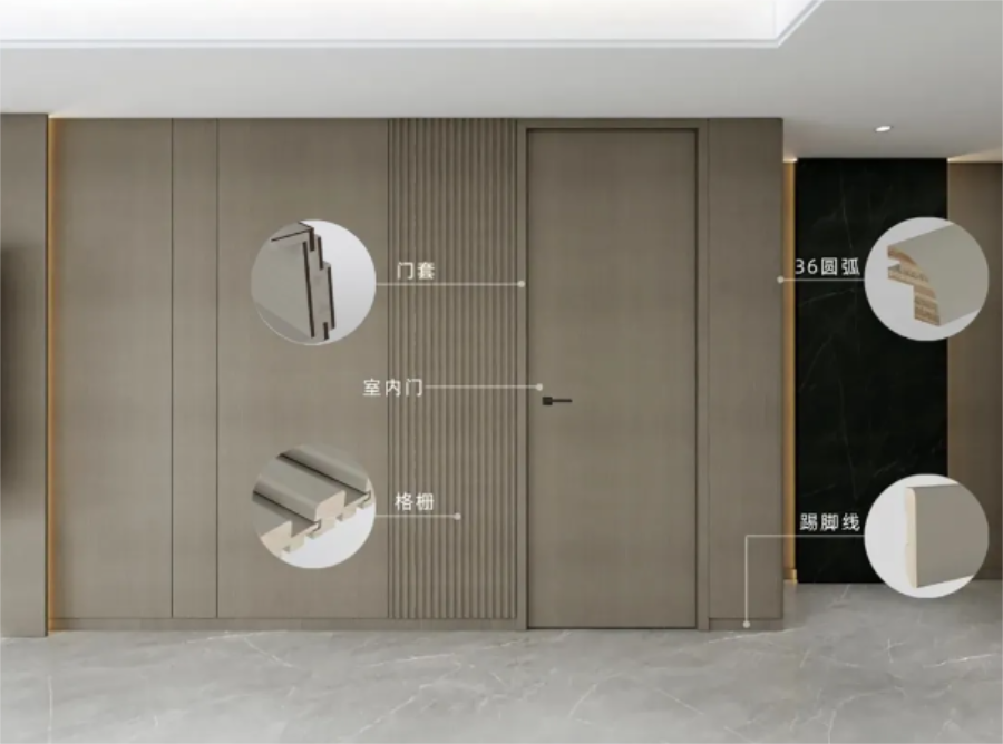 門墻柜系統(tǒng)涵蓋板材、室內(nèi)門、圓弧、實木格柵、埡口、門套線、踢腳線,打通23款花色,材質(zhì)、色彩統(tǒng)一,實現(xiàn)門墻柜全屋同色一體。