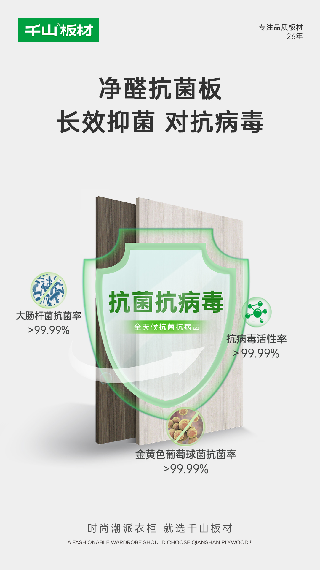 千山板材重磅升級新一代凈醛板,在國標ENF級和F☆☆☆☆環保標準的基礎上構建凈醛、抗菌、抗病毒的三重防護層,用實際行動踐行初心使命,為消費者帶來超環保的健康美好生活。