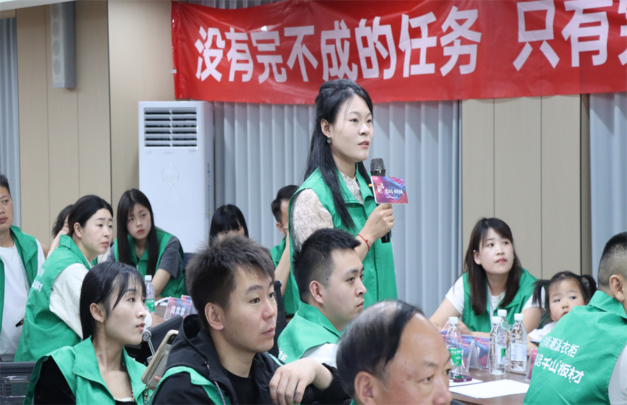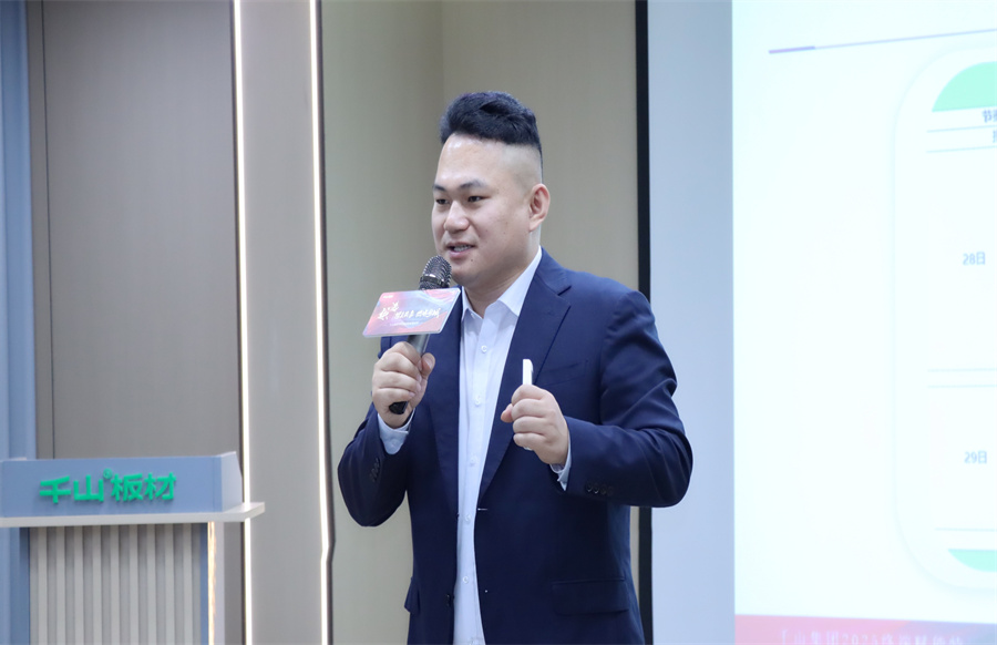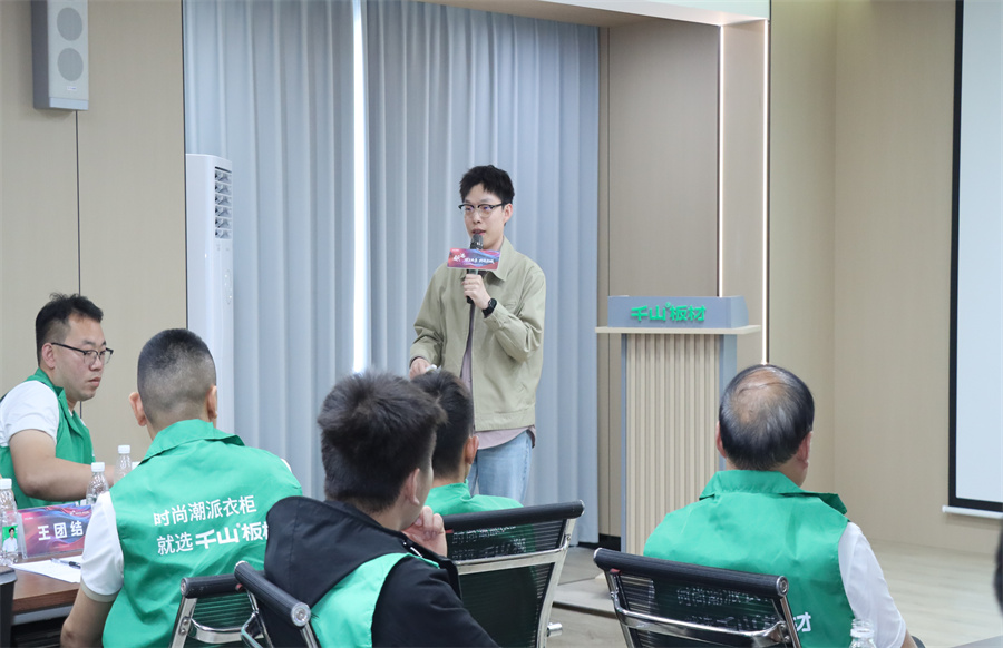 終端賦能不是選擇題,而是關乎生存的必答題!千山板材華中大區經理王殿忠致辭。王總表示,面對數字化變革浪潮,千山果斷提出“雙線融合、雙核驅動”戰略:線上構建營銷矩陣,線下打造終端門店體驗場景,而抖音同城和直播正是貫穿線上的流量支點,千山終端賦能特訓將引導助力經銷商伙伴撬動業績轉化增長。