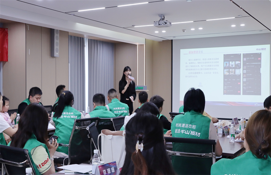千山板材河南運營中心總經理程效章致辭。程總表示,短視頻和直播已成為搶占市場的核心賽道,抖音也將是經銷商伙伴們開拓新市場的“超級武器”,希望伙伴們通過此次賦能特訓掌握短視頻的營銷密鑰,在家居藍海中共贏未來!