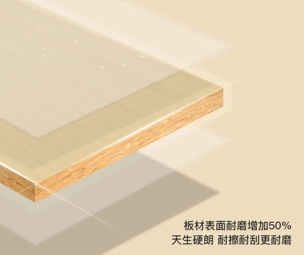 高密度離子晶體層有效分散外部壓力,吸收沖擊能量,從而顯著增強板材的垂直承載極限。20mm厚度,超出行業板材普遍厚度(18mm)10%,有效提升了板材的承重力,承重性能提升50%,輕松應對大空間儲物承壓需求。