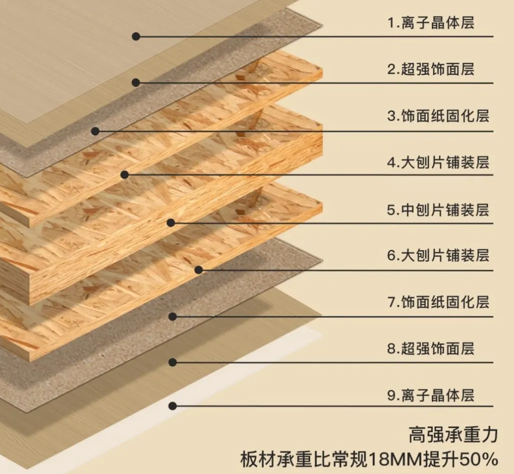 采用德國迪芬巴赫連續平壓線生產,內芯刨片均勻縱橫交錯壓合。5層定向鋪裝結構,使其內結合強度更高,從而賦予了離子晶體板穩定堅韌的特性,能夠經受住南北方特殊氣候考驗,耐用周期延長10年。