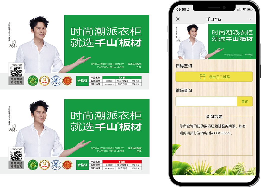 刮開涂層,掃描千山防偽商標二維碼,關注微信公眾號(千山板材),點擊防偽查詢,輸入16位或20位防偽碼。